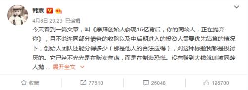 |  4月4日,当美团CEO发布内部信(定了!美团王兴发内部信 宣布收购摩拜),宣告着曾经中国共享经济里最大一批黑马已经被收编麾下,而其创始人们也足以实现财富自由,成为无数创业者心中的神往和美谈。   其中最吸引人和有话题性的,必当是创始人中的唯一女性,且还是一位年轻的美女,胡玮炜。一时间各路公众号文章也铺天卷地,极力讴歌这种新时代的正能量。   而其中更是以一篇“心灵鸡汤”样式的文章《摩拜创始人胡玮炜套现15亿:你的同龄人 正在抛弃你》,因为内容简单明了通俗易懂,作者“王耳朵先生”举的身边例子最容易让人有共鸣,从而获得了最为广泛的传播。   当然,网络上也出现了零星的不一样的声音,《记者真的也有春天?其实不是谁都能成为摩拜总裁胡玮炜》一文里首先就指出媒体已经过分夸大了胡玮炜在摩拜中的分量,其充其量更像是一个对外的形象代言人。而普通人的创业之路,如果没有遇到一直鼎力相助的“贵人”,似乎也并没有什么可以说道的,毕竟韩寒也说了,创业就是“九千九百九十九死一生”的事情。   而一向关心家国天下,社会时事的青年作家代表韩寒就更直截了当了,直指那篇流传甚广的朋友圈热文“它已经不光光是在贩卖焦虑,而是在制造恐慌。”   韩寒评论全文如下:   今天看到一篇文章,叫《摩拜创始人套现15亿背后,你的同龄人,正在抛弃你》,且不说连同部分债务的收购以及中后期进入的投资人需要优先结算的情况下,创始人团队还能分得多少(那是他人的合法应得),对这种标题我都是极讨厌的。它已经不光光是在贩卖焦虑,而是在制造恐慌。没有赚到大钱就叫被同龄人抛弃了吗?很多人也都在努力干活认真生活,成功的定义绝不只是套现几亿十几亿。身价千亿的首富,面对一个园丁,一个美编,一个程序员,都不存在抛弃不抛弃的关系,时代里不同人就是有着不同的分工和命运,也各有不同的幸福。安于现状或不甘如此都是每个人自己的内心意愿,他人不可强加。   那篇文章里有一段写道:“要么在北上广的写字楼里,刚刚成为一个总监,小腹上长出赘肉,每月因为房贷不敢辞职。要么在三四线城市里,过着平淡,却一眼可以看到未来的日子。”我不明白这些有什么不对不好的,当了总监肚子上有赘肉怎么了?觉得爸爸肚没问题的就留着,嫌弃自己有赘肉就去健身;因为房贷不敢辞职难道不正确吗,没有自己更喜欢的工作或者更明确的方向,辞职了是这篇文章的作者来养你吗?三四线城市一眼能看到未来的日子不好在哪?有人就是不喜欢飘摇动荡起伏不定有问题吗?   身边很多朋友也在创业,成功失败都有。类似这种文章,估计又得鼓动一批人头脑一热想着如何暴富。创业不等于发财,创业大多是挫折与失败,尤其是你没有做好充分准备和科学论证的情况下,创业基本也就是九千九百九十九死一生。如果你只是不想朝九晚五当员工,这个社会也有很多道路可以走,未必都要当老板。若你义无反顾,内心坚定,而且性格就是如此,那你做好吃苦的准备就去干一番。但如果你看了那篇文章,心潮澎湃想要去抛弃其他同龄人,以这样的定力和心智,去开公司,估计也只能春夏秋冬,造福房东。   韩寒的说辞或许因责备心切而不够严谨和完全客观,但朋友圈里鸡汤文章泛滥,各种“伪女权”、“焦虑体”、“佛系XX”等等轮番轰炸眼球已成为不争的事实,或许在自媒体井喷式的时代,如何维护自己思维的统一性而不轻易被带偏,也是一门亟需重视的课程。 |