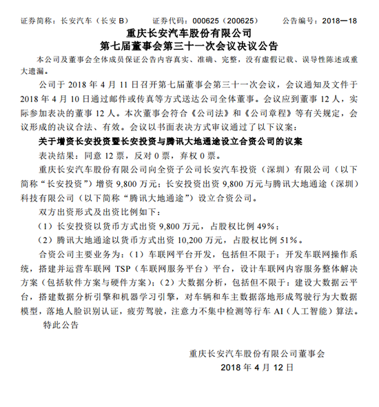 新浪财经讯 4月12日,长安汽车(11.380, 0.22, 1.97%)午间在深交所公告称,子公司长安汽车投资(深圳)有限公司拟与腾讯大地通途(深圳) 科技有限公司设立合资公司。合资公司主要业务为车联网平台开发、大数据分析等。长安投资、腾讯大地通途在合资公司各占股49%和51%。