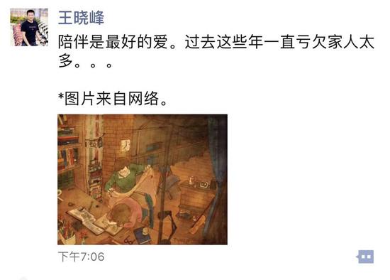 几分钟后,他发了一条朋友圈,写着“陪伴是最好的爱。过去这些年一直亏欠家人太多。。。” |
