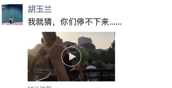 胡玮炜在朋友圈中发了一条“跳河”的短视频,配文“我就猜,你们停不下来……”她没有发有关王晓峰的动态。