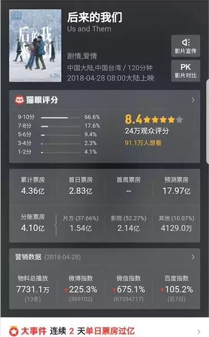 “后来的我们,什么都有了,却没了我们”,男女主在影片最后的这句感慨戳中了不少观众的泪点。事实证明,这一情感攻势十分有效,《后来的我们》预售票房过亿,上映仅数小时票房破2亿,截至4月29日15:30时许,票房已攀登至4.3亿元。奶茶处女作、回忆杀歌曲改编、人气演员主演、名导客串,拥有诸多光环、打情感共鸣牌的《后来的我们》不禁让人充满期待,能否成为下一个《前任3》?