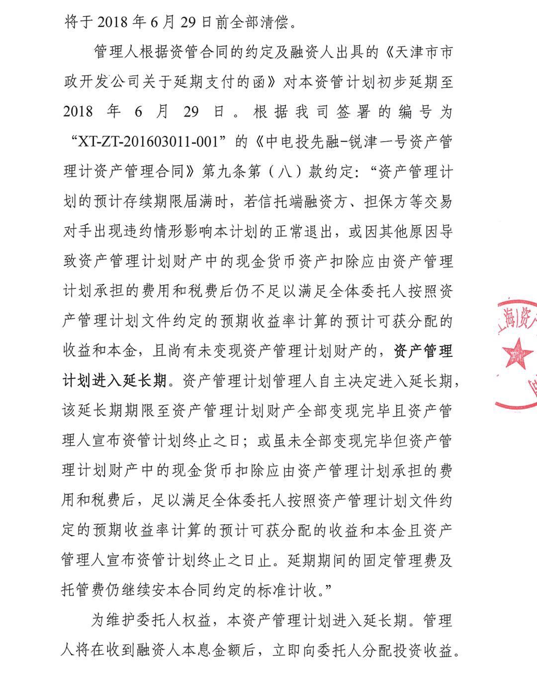 此外,国通信托已经发函告知委托人天津市政开发尚有部分贷款本息未清偿,后续将严格根据委托人指令采取措施。