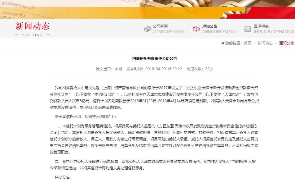 国通信托表示,根据委托人中电投先融的意愿在2017年设立了“方正东亚·天津市政开发流动资金贷款集合信托计划”,以信托资金向天津市政发发放了信托贷款共计5亿元,信托计划各期限已于2018年3月23日至4月14日陆续届满到期,因借款人天津市政开发尚有部分贷款本息没有清偿,该信托计划尚未清算结束。