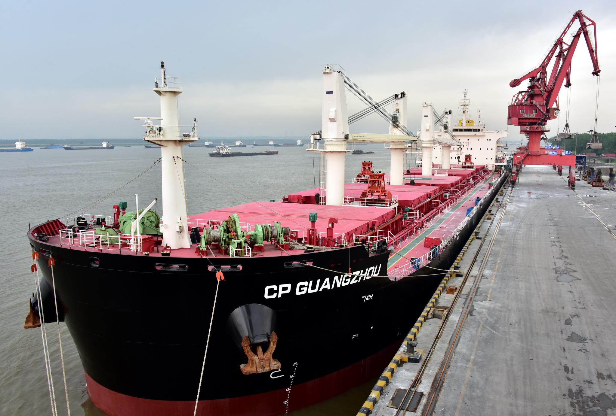 5月8日上午,一艘马绍尔籍5万吨级海轮停靠在南京港龙潭港区天宇码头,正在进行装载作业。当日下午,这艘满载着化肥的海轮将沿着长江12.5米深水航道驶向大海。