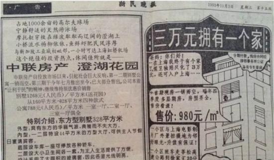 1993年11月3日的《新民晚报》上一则房地产广告显示:三万元拥有一个家……售价980元/平方米。