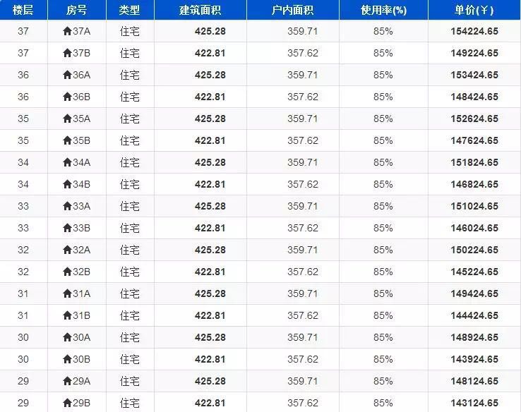 422平户型单价最高,基本在15万/平以上,总价都在6000万以上。