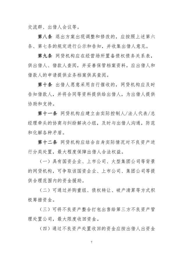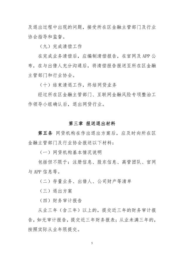 此外,《指引》要求网贷机构决定清理网贷业务、退出网贷行业的,先向所在区金融主管部门和行业协会报备退出意向,成立退出工作领导小组、清理存量业务并编制清单、编制退出方案、报送退出方案、发布退出公告、组织实施退出方案、及时向主管部门及协会汇报退出工作进程及出现问题、完成清偿工作等程序进行。