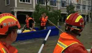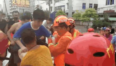 ↑汕头市潮阳区谷饶镇,消防官兵涉水前行,营救被困群众
