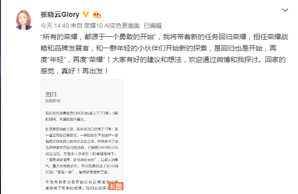 新浪科技讯 9月3日晚间消息,张晓云今日在微博发文称,根据公司的最新安排,自己将回归荣耀手机,担任荣耀首席战略和品牌发展官。