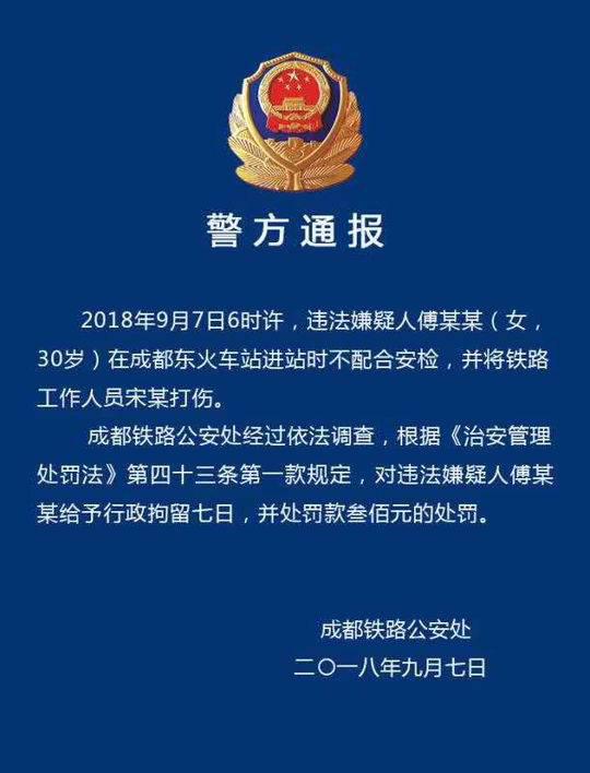 通报称,2018年9月7日6时许,违法嫌疑人傅某某(女,30岁)在成都东火车站进站时不配合安检,并将铁路工作人员宋某打伤。