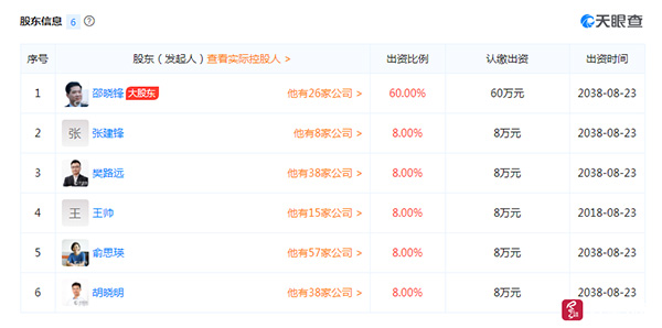除邵晓锋认缴出资60万元占股60%以外,其余五人均认缴出资8万元,占股8%。