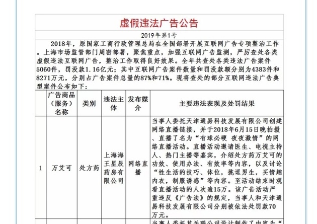 1月21日,上海市市场监督管理局发布今年首个虚假违法广告公告,公布上海市市场监管部门查处的12件典型虚假违法广告案例。其中,上海海王星辰药房有限公司(以下简称上海海王星辰)为“万艾可”进行的网络直播广告,便是其中之一。