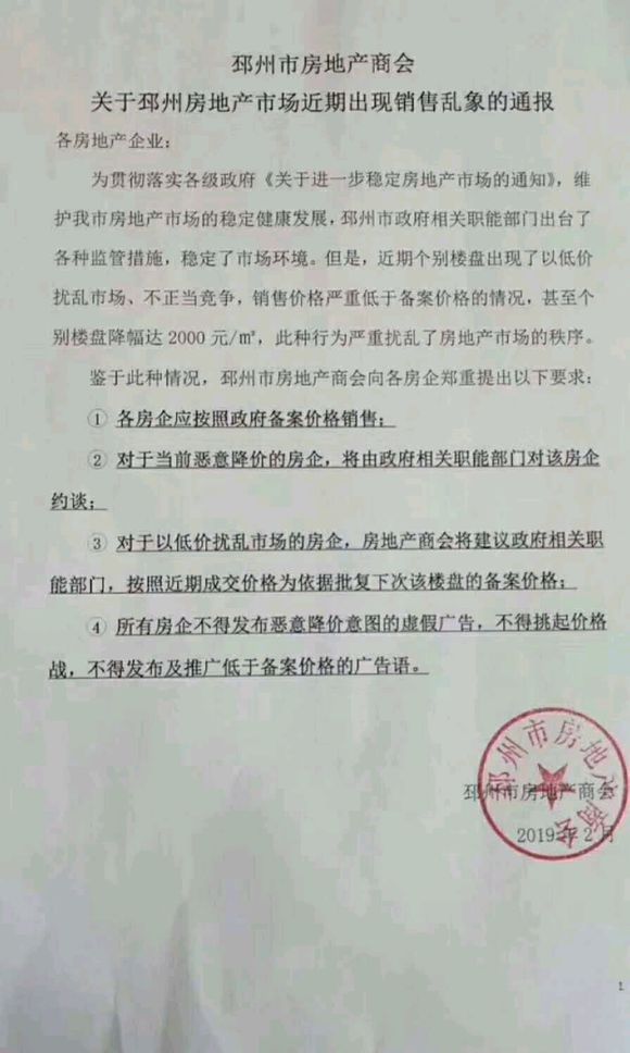 2月2日,江苏省邳州市房地产商会发布的《关于邳州房地产市场近期出现销售乱象的通报》在网上传开。