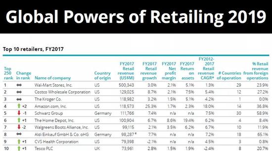 德勤(Deloitte)根据2017财年(截至2018年6月的财政年度)全球各大零售商公开的数据,发布2019年度全球零售商力量报告(Global Powers of Retailing 2019)。沃尔玛仍然位居第一,但亚马逊继续上升至第四位。中国名次最高的是京东,升至第20位。