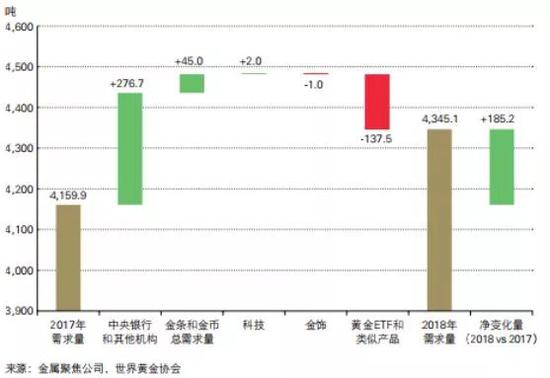 数据显示,2018年,全球黄金总需求4345.1吨,而2017年同期为4159.9吨,略低于过去5年的平均需求量4347.5吨,其中央行购金几乎是2018年全球黄金市场需求的唯一亮点,各大央行购买黄金量巨幅增长了74%,反映出新兴市场央行进一步多元化资产配置的需求。