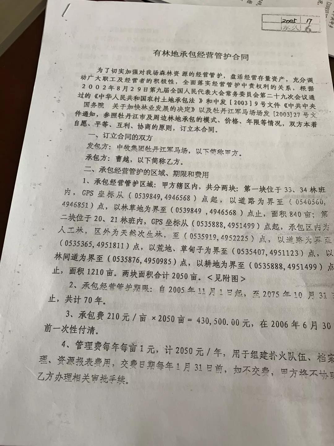 郭靖华:“牡丹江军马场还租了一种无林荒地,是在曹园之前,就已经运作了。无林荒地就是荒山租给社会人员,每一年给军马场一亩地20元到50元不等,根据离公路的远近。租最少的无林荒地也一年20元,和有林地3元一年一比,价格差别太大。”