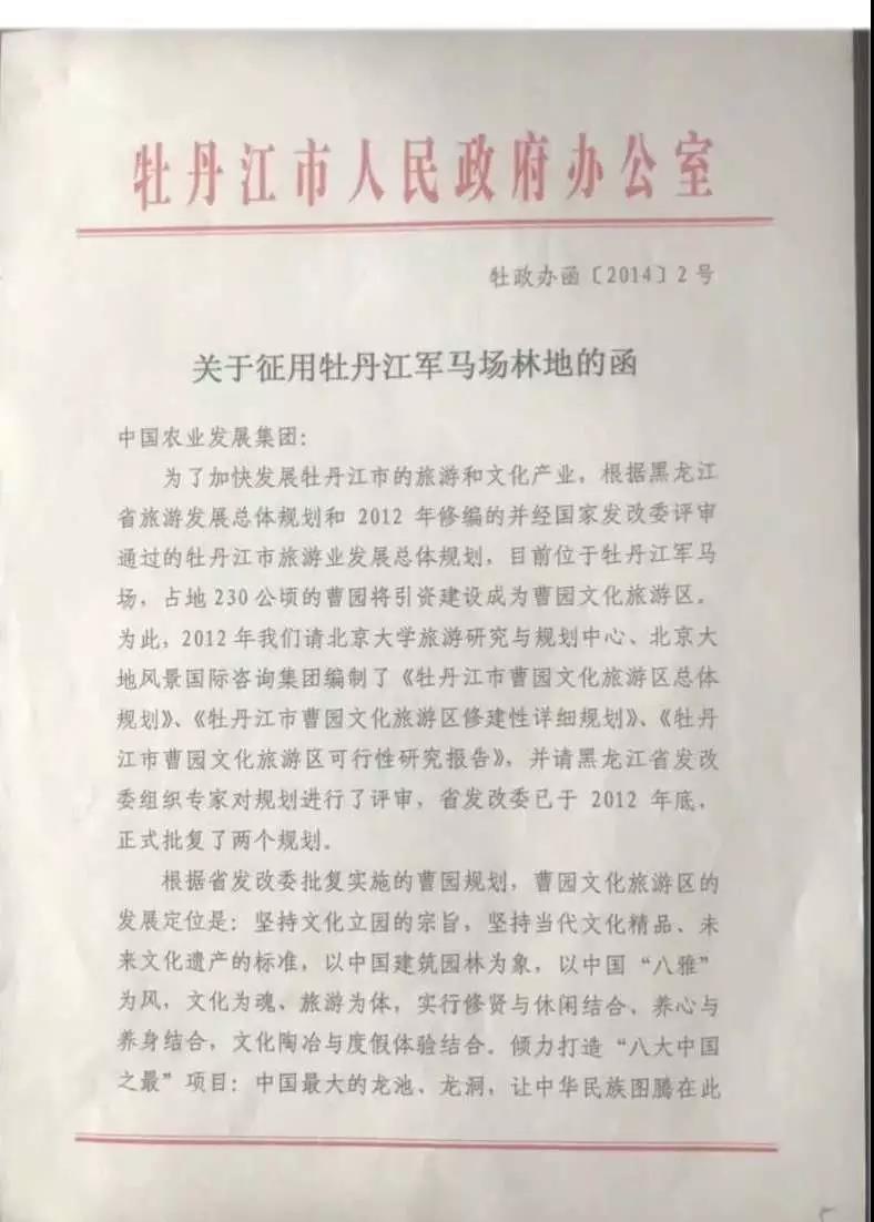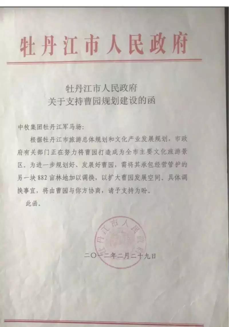 牡丹江市政府2012年曹园拟建项目向军马场发出的公函