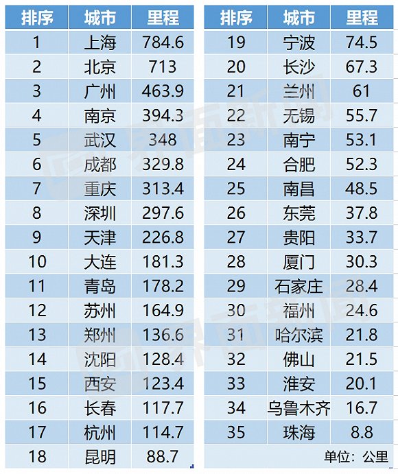 从运营线网规模看,共计17个城市的线网规模达到100公里或以上,其中上海以784.6公里的里程荣登榜首。北京是另一个运营里程超过700公里的城市,达到713公里。紧随其后的是广州、南京、武汉、成都等城市。