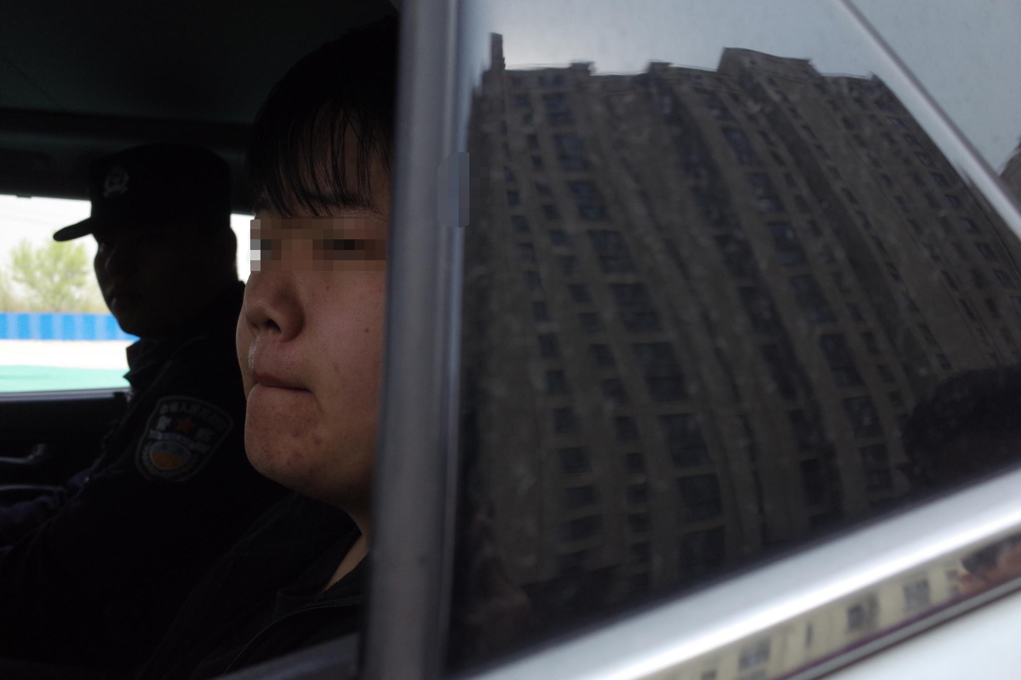 被执行人坐在警车上,沉默不语。实习生 陈婉婷 摄