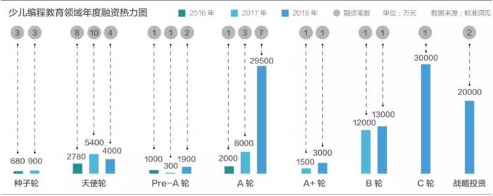 相关数据显示,2017年国内共有30个编程项目成立,2018年该行业共发生43笔融资交易,仅2018年上半年,投融资事件就已与2017年全年持平。步入2019年,少儿编程赛道上的多位选手相继宣布融资消息,包括获得亿元B+轮融资的小码王,拿到第八轮融资并宣布两年内IPO的编程猫等。