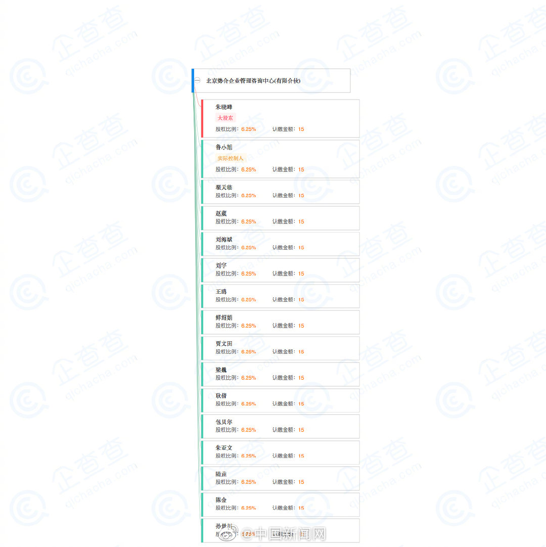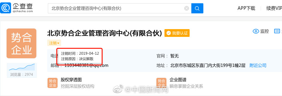 @中国新闻网 4月16日消息,记者在企查查企业信息平台上注意到,北京势合企业管理咨询中心(有限合伙)已于4月12日注销,注销原因为决议解散。其中,翟天临、朱亚文、包贝尔等16人曾任股东,持股比例均为6.25%,认缴出资额均为15万。该公司成立于2016年8月17日,经营范围包括企业管理咨询、企业管理、餐饮管理、经济信息咨询、会议服务、礼仪服务。