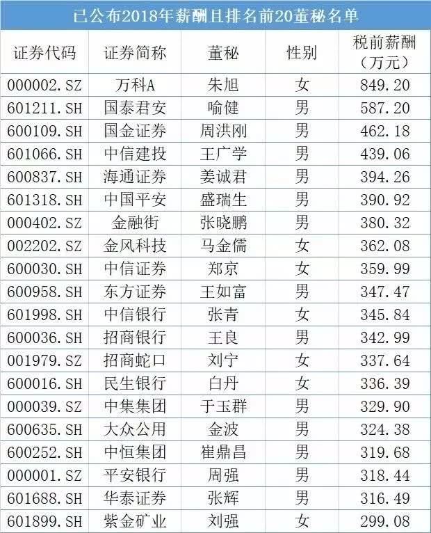 其中,高喊“活下去”的万科,其董秘朱旭以849.2万元的高薪排行第一,比去年多了27万元,笑傲董秘圈。事实上,近5年来,在董秘薪酬排行榜的榜首位置,万科董秘和泛海控股(7.820, 0.09, 1.16%)的董秘几乎轮流坐庄。