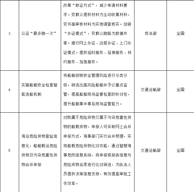 2.贸易便利化领域:“海运危险货物查验信息化,船舶载运危险货物及污染危害性货物合并申报”、“国际航行船舶进出境通关全流程‘一单多报’”、“保税燃料油跨港区供应模式”、“海关业务预约平台”、“生产型出口企业出口退税服务前置”、“中欧班列集拼集运模式”等6项。