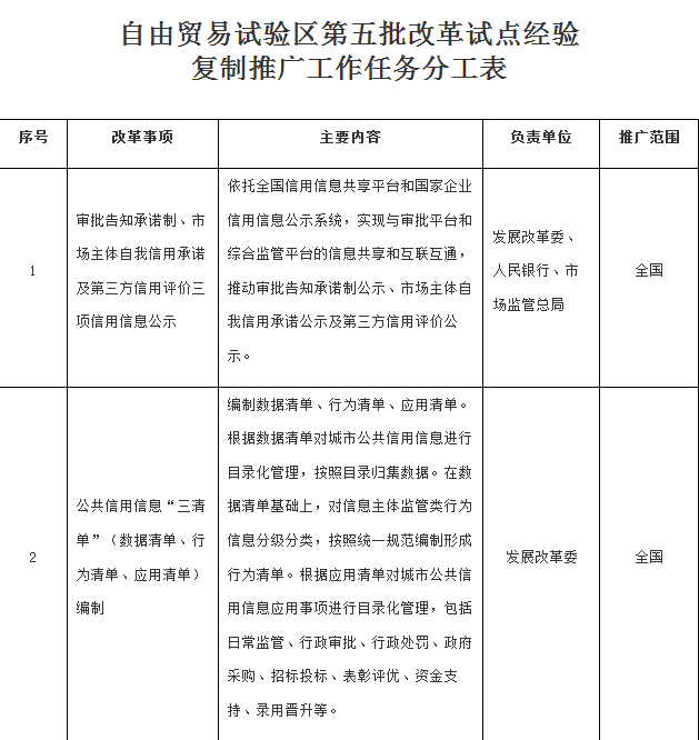 附:自由贸易试验区第五批改革试点经验复制推广工作任务分工表