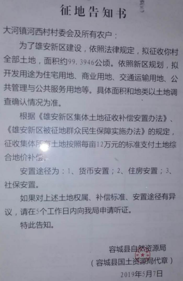 雄安发布消息,5月7日,雄安新区召开党工委委员会议,批准容城县实施2019年第一批次城市用地土地转用征收工作,标志着雄安新区征迁安置工作正式启动实施。容城县自然资源局分别在大河镇河西村、八于乡龚庄村村务公开栏张贴征地告知书。