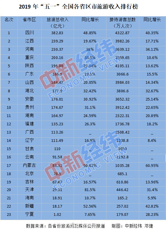 “五一”假期,全国国内旅游接待总人数1.95亿人次,实现旅游收入1176.7亿元。截至5月7日17时,23个省份公布数据,15省份旅游收入过百亿,包括四川、江西、河南、重庆、陕西、广东、山西、湖北、安徽等。其中四川以382.83亿元位列第一。