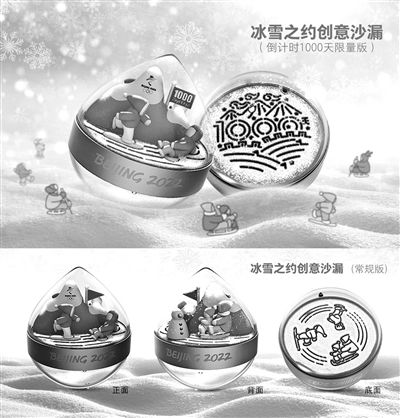 “冰雪之约”创意沙漏以传统民间冰雪运动为主题,意在结合倒计时节点呼吁公众关注和参与冰雪运动。创意沙漏有两款设计,常规版为不限量商品,倒计时1000天纪念特别版限量发售1000个。此外,此次还将上线一款限量2022枚、仅在天猫奥林匹克官方旗舰店销售的线上专供徽章,以及“冬奥映彩”纪念银章、“银雪记印”配饰、倒计时纪念T恤、倒计时纪念邮品、5月10日北京冬奥会倒计时1000天主题活动现场同款纪念T恤和纪念徽章。其中,纪念徽章设计元素为主题活动举办地标志性建筑。