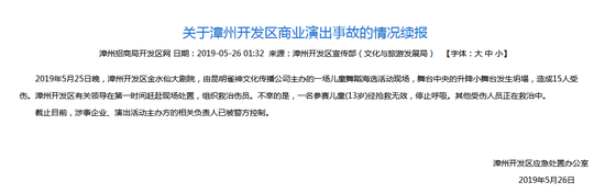 2019年5月25日晚,漳州开发区金水仙大剧院,由昆明雀神文化传播公司主办的一场儿童舞蹈海选活动现场,舞台中央的升降小舞台发生坍塌,造成15人受伤。漳州开发区有关领导在第一时间赶赴现场处置,组织救治伤员。不幸的是,一名参赛儿童(13岁)经抢救无效,停止呼吸。其他受伤人员正在救治中。