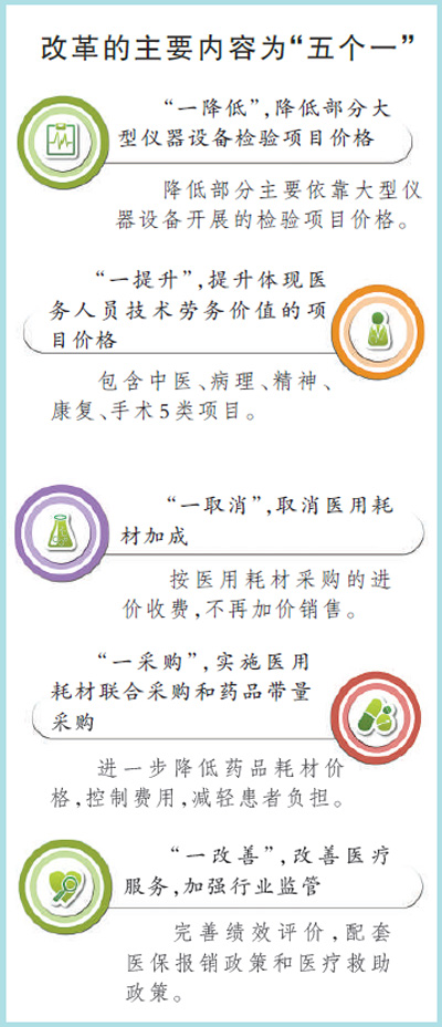 此次改革可概述为“五个一”,即“一降低、一提升、一取消、一采购、一改善”。雷海潮介绍,“一降低”,是指降低仪器设备开展的检验项目价格;“一提升”,是指提升中医、病理、精神、康复、手术等体现医务人员劳动价值的项目价格;“一取消”,是指取消医疗机构医用耗材5%或10%的加价政策,按医用耗材采购进价收费;“一采购”,是指实施医用耗材联合采购和药品带量采购;“一改善”,是指改善医疗服务,加强综合监管。
