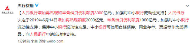 6月14日晚间,央行再度动用数量型工具,决定于2019年6月14日增加再贴现额度2000亿元、常备借贷便利额度1000亿元,加强对中小银行流动性支持,保持中小银行流动性充足。中小银行可使用合格债券、同业存单、票据等作为质押品,向人民银行申请流动性支持。