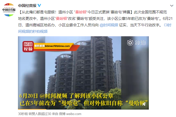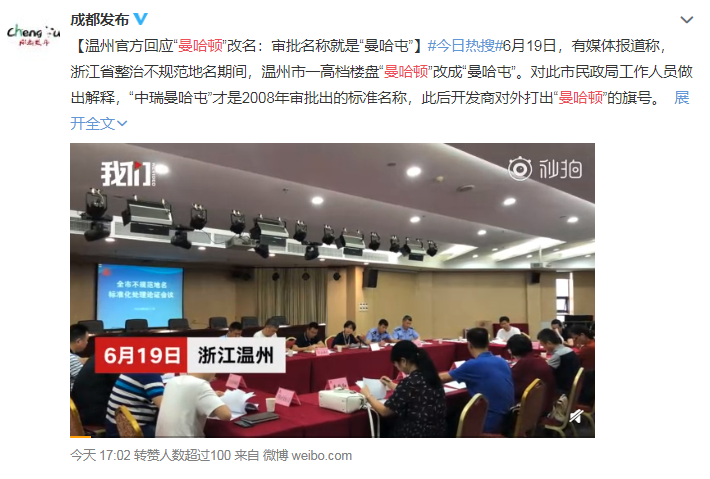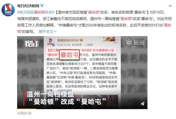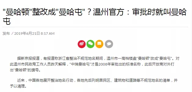 6月19日,有媒体报道称,浙江省整治不规范地名期间,温州市一高档楼盘“曼哈顿”改成“曼哈屯”,引发网友热议。网友们看到后纷纷欢乐留言称“气质一下从北美打到东北!”。“温州曼哈顿改名”一度成为热搜。