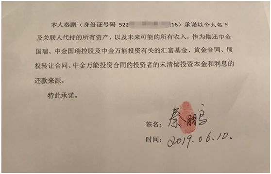 6月10日,在投委会的多方努力下,秦鹏终于露面与投资者代表协商清算事宜。在这次会议上,秦鹏签下一份还款保证书,保证书显示“本人秦鹏承诺以个人名下及关联人代持的所有资产,以及未来可能的所有收入,作为偿还中金国瑞、中金国瑞控股及中金万能投资有关的汇富基金、黄金合同、债券转让合同、中金万能投资合同的投资者的未清偿投资本金和利息的还款来源。”