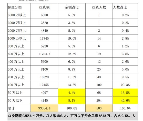 证券时报记者拿到的一份《投委会与秦鹏见面会议纪要》显示,牵涉其中的投资人总共有503个,总投资金额达到9.4亿元。投资1000万元以上的有18人,50万元以下的有204人,占投资人总数的40.6%,大部分投资人的出资金额介于50万元至1000万元之间。
