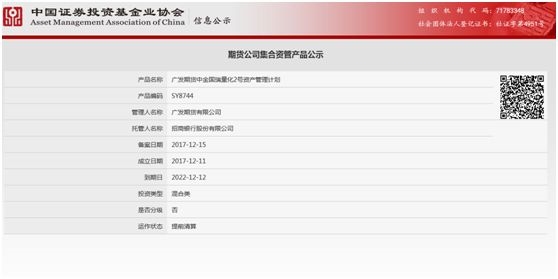 第一个产品“华泰期货紫金财富中金国瑞量化1号资产管理计划”成立于2016年7月5日,到期时间为2017年7月4日,运作状态为正常清算;第二个产品“广发期货中金国瑞量化2号资产管理计划”成立于2017年12月11日,到期时间为2020年。该计划募集时间为2017年12月6日至8日,仅两天便完成了募集工作,运作状态显示为“提前清算”。