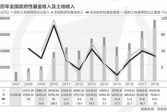 根据财政部数据,2008年全国政府性基金收入约1.56万亿元,其中地方政府国有土地使用权出让等收入约1万亿元,占基金总收入比重约64%。随后几年数据呈现波动上升态势,到2018年,全国政府性基金收入约7.54万亿元,其中地方政府国有土地使用权出让等收入约6.51万亿元,占基金总收入比重约86%。