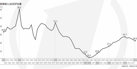 新中国成立之初,百废待兴,财力分散薄弱,在计划经济时期建立了“统收统支”的财政体制。这反映在财政收入占GDP比重维持在较高水平,1960年达到39.3%最高点。