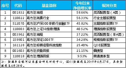 据银河证券统计,截至6月末,全部开放式基金各类型冠军中,易方达独占9只(已合并不同份额、联接,若分计则共有13只)。
