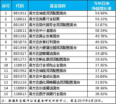 从收益率来看,据银河数据,易方达今年上半年共54只产品收益率超过20%(已合并不同份额、联接,若分计则共有66只)。
