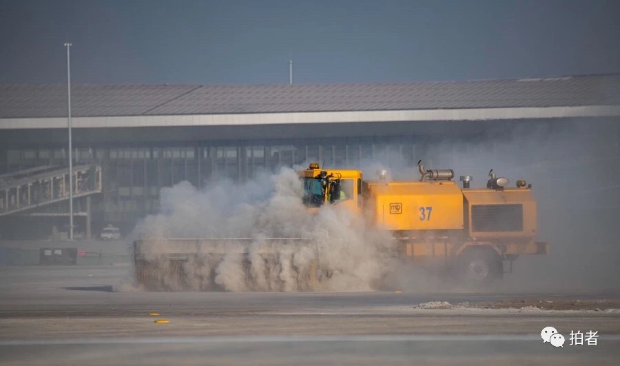△ 2019年1月21日,机场跑道飞行校验前,工作人员正在用大型设备清理跑道。摄影 / 新京报记者陶冉