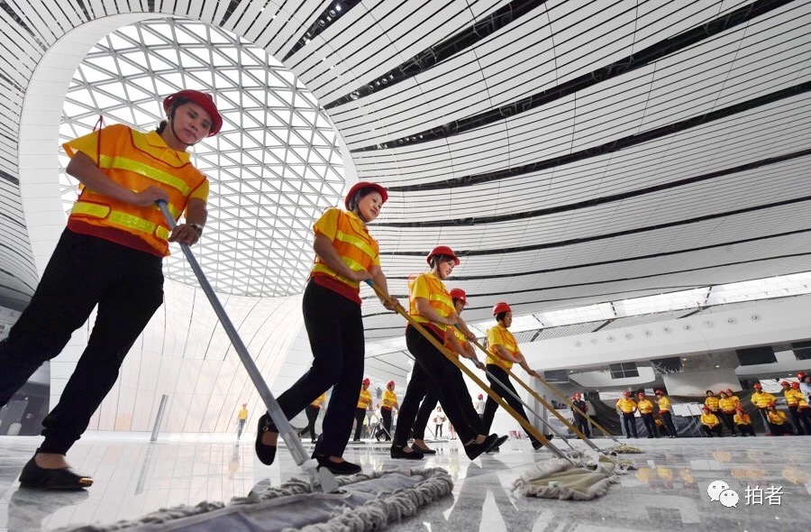 △ 2019年6月18日,保洁人员在北京大兴国际机场航站楼整体开荒保洁工作全面开始。摄影 / 新京报记者李木易