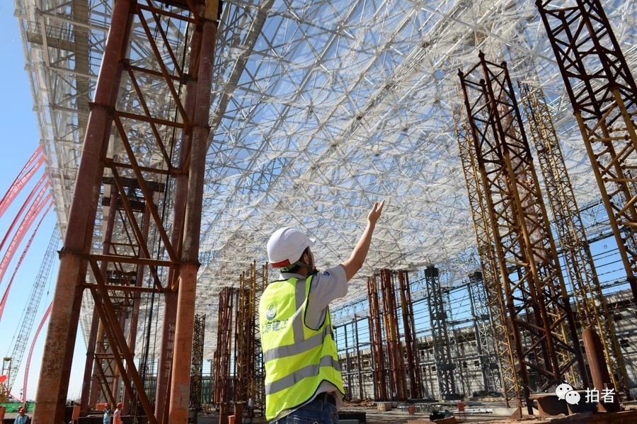 △ 2018年9月3日,北京新机场南航基地1号机库钢结构屋架成功提升就位,标志着这座亚洲最大机库封顶。摄影 / 新京报记者吴江