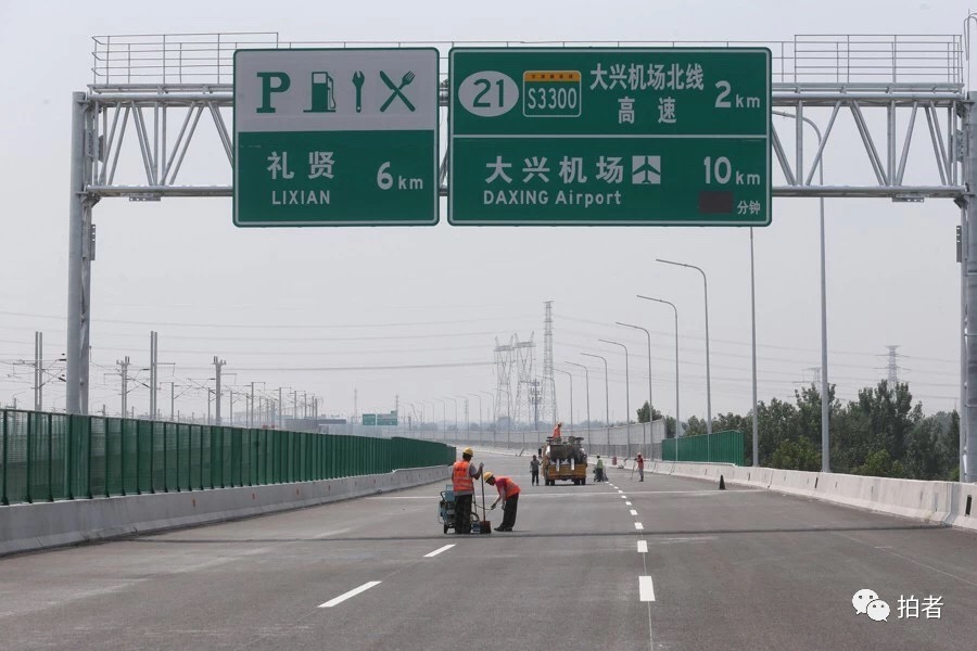 △ 2019年6月17日,工作人员在北京大兴国际机场高速公路画交通标志线。摄影 / 新京报记者王贵彬
