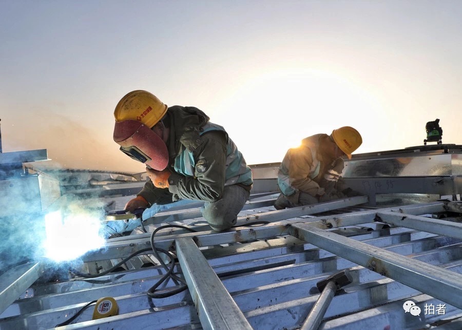 △ 2018年1月16日,施工人员正在航站楼楼顶进行焊接作业。摄影 / 新京报记者王飞
