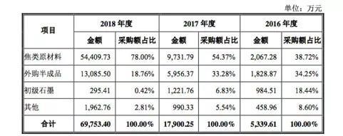 根据招股书,拿原材料采购来说:2018财年凯金能源原料采购目录中,有1.3亿元用来采购半成品,其中98.96%为石墨化加工后半成品。