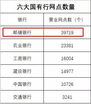值得注意的是,以目前可以查询到的资料,邮储银行营业网点数量39719个,不仅在国内数量最多,全球也是数量最多的;位居其后的农业银行(3.600, -0.02, -0.55%)、工商银行(5.890, -0.02, -0.34%)的网点数分别为23381个和16004个。