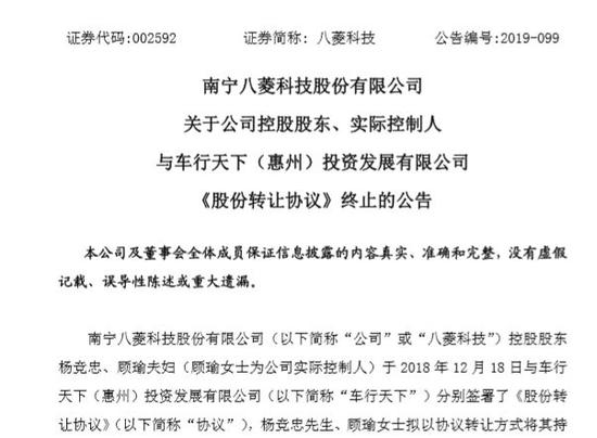 近日,八菱科技实控人夫妇与车行天下(惠州)投资发展有限公司(以下简称车行天下)6.23亿元的股权转让交易宣告终止,这已经是八菱科技控股股东近段时间来第二次股权转让失败。